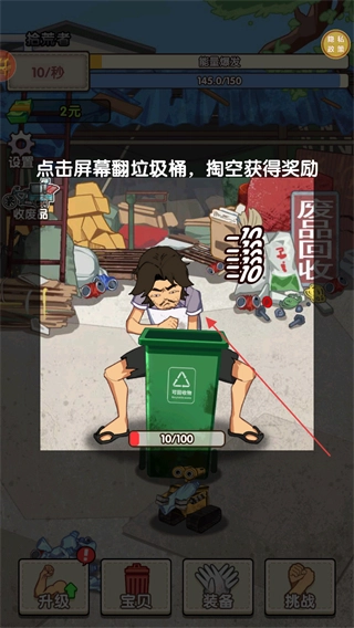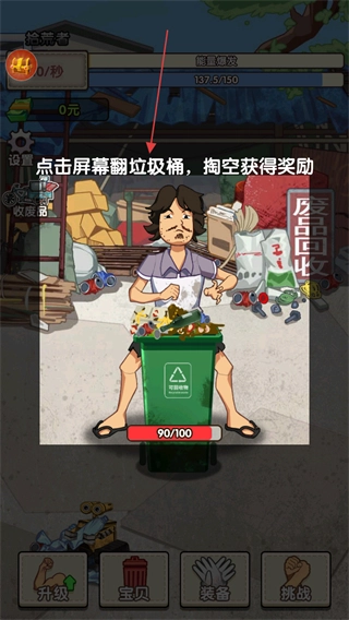 点击屏幕就能翻动垃圾桶,把垃圾桶里的东西都掏空后,就能得到金币、道具这类奖励。