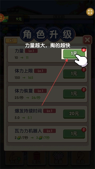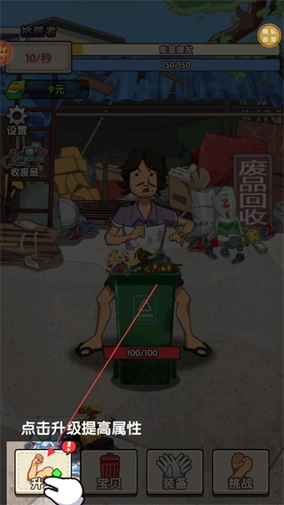 在角色升级界面,消耗金币来提升力量这类属性(比如把力量从10点增加到11点),就能让掏垃圾桶的效率得到提高。