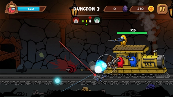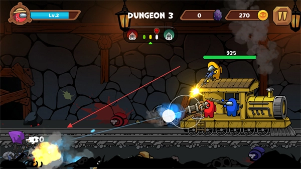 等级提升后,继续在洞穴场景中攻击敌人,保持火力输出,保障火车前进。