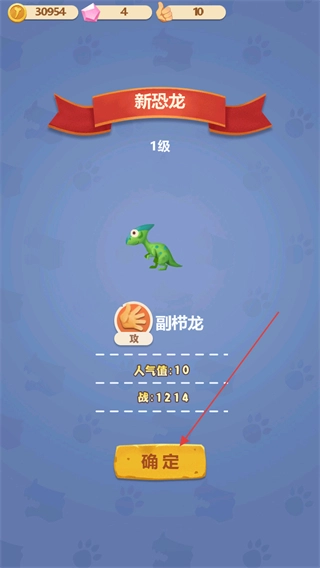 成功复活出了新的恐龙,下方能查看恐龙的详细信息和攻防属性,点击确定按钮就能把恐龙送到公园。