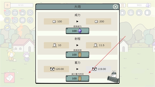 进入大炮界面,消耗资源来提升蓄力等相关属性,以此增强大炮的整体能力。