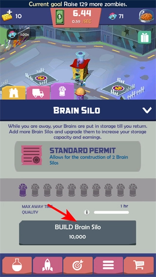 当积累到足够的资源后,进入建筑界面并点击BUILD Brain Silo按钮,建造大脑存储设施。这类建筑能够提高离线状态下的资源存储上限,从而帮助推进关卡。