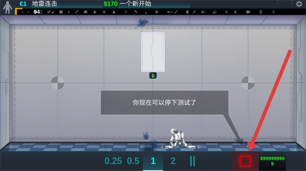当机器人触发地雷后,请点击右下角的红色方块停止按钮,以此结束当前测试。