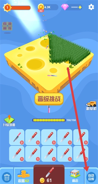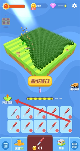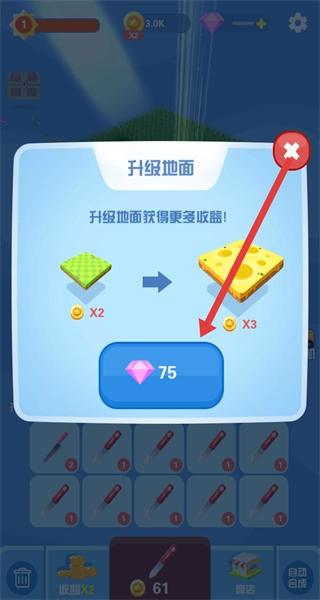 花费75钻石完成地面升级,可把地面收益从2倍提高到3倍,提升割草后的金币收入。