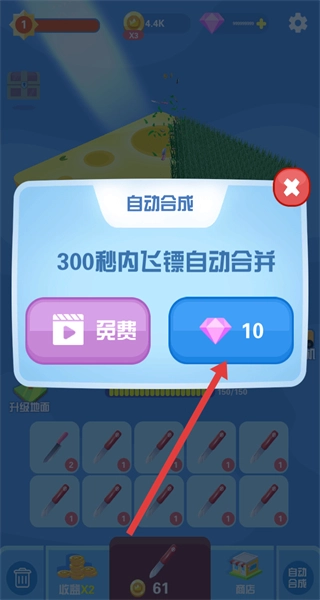 选择消耗10颗钻石,就能激活300秒的飞镖自动合并功能,系统会自动完成飞镖升级,让割草效率得到提升。