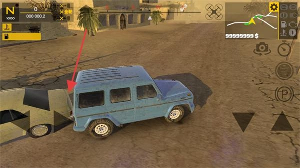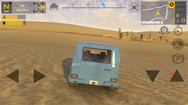 在沙漠地形的驾驶场景里,通过右侧方向键来操控车辆行进,按照地图指引的目标方向移动,从而完成驾驶任务。
