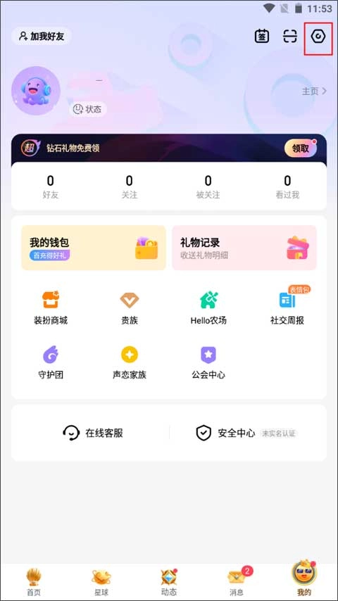 3、进入个人信息界面后,点击右上角的“齿轮”形状图标,即可打开设置界面。