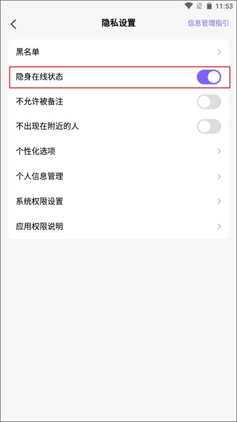 5、在隐私设置界面点击“隐身在线状态”后面的圆点