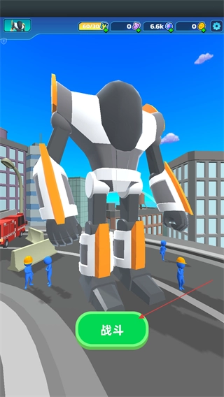 点击界面下方的战斗按钮,就能进入城市场景的战斗关卡,这时机甲处于待战状态,周围能看到建筑和角色,准备开启对战流程。