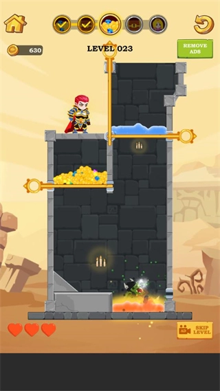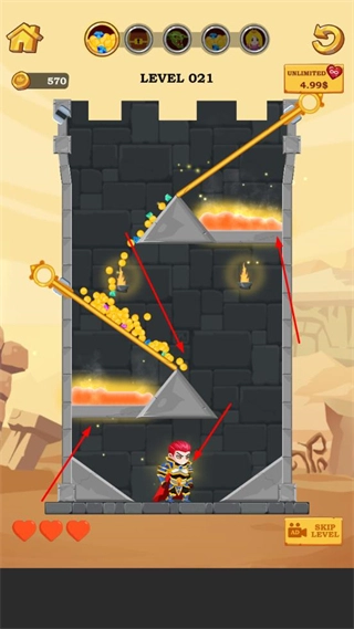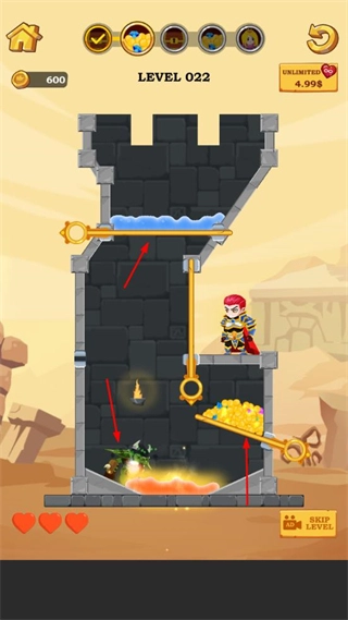 当面对多层火焰障碍时,要按照特定的路径顺序拔除插针,引导宝藏避开火焰区域,使其能够安全下落到角色所在位置,这样就能顺利通关。