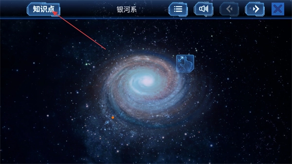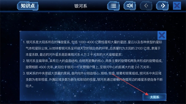 进入展示银河系的界面后,点击界面左上角的知识点按钮,就能查看银河系相关内容,从而推进探索进程。