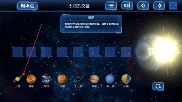 当处于太阳系交互界面时,请按照提示把下方的行星图标拖动到上方对应的位置,以此完成行星位置的匹配任务。