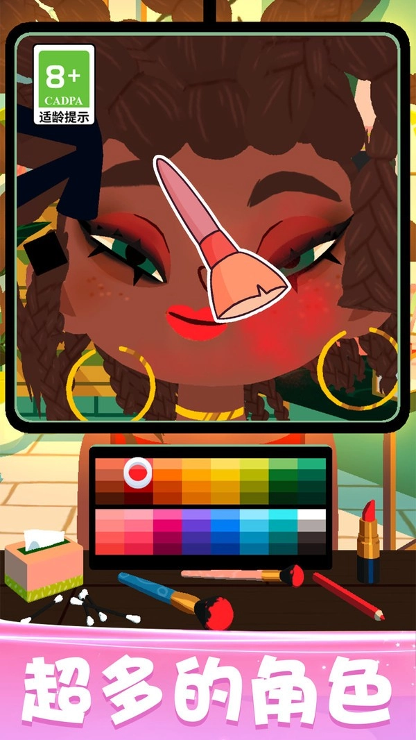 这款游戏配备了丰富多样的化妆工具与色彩选项,同时允许玩家自由搭配眼影、腮红、唇彩等各类美妆产品,整体操作方式简洁易懂,十分直观。
