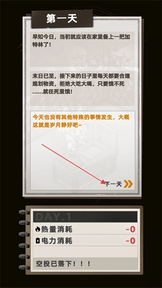 阅读完第一天对应的剧情内容后,点击界面上的“下一天”按钮,就能推进到后续的游戏天数进程。