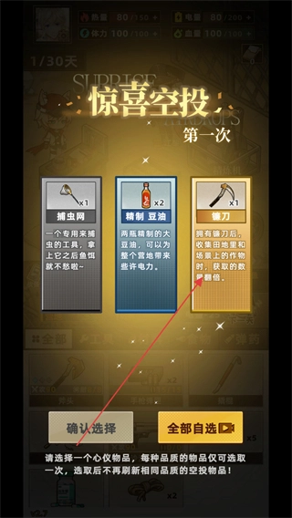 在惊喜空投界面挑选好想要的物品后,点击确认选择按钮,就能得到该空投物品并继续游戏。