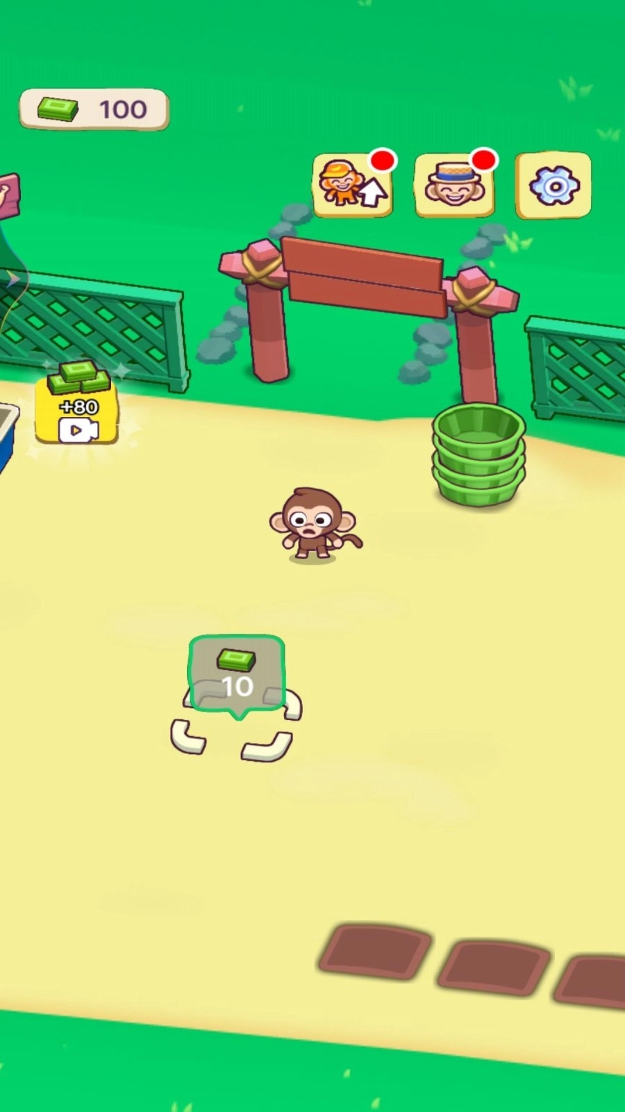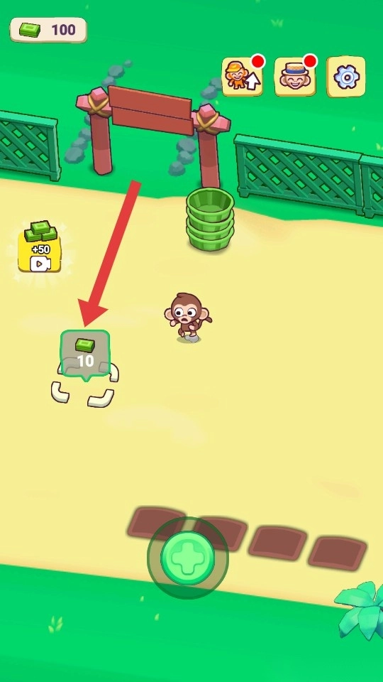 1、进入游戏后,注意观察左上角显示的【100】金钱数值,操控猴子移动到地面标注有【10】的区域,在此处建造收银台。
