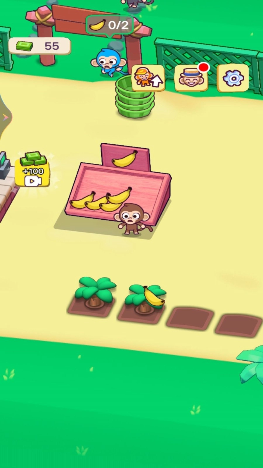 4、留意猴子顾客头顶显示的【香蕉-0/2】【香蕉-0/3】这类需求标识,需及时补充对应物品以满足它们的需求,从而完成交易并获得收益。