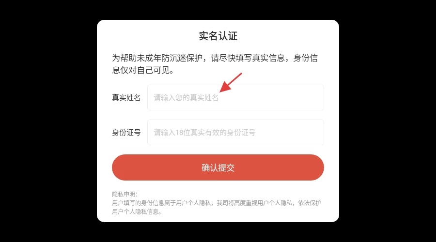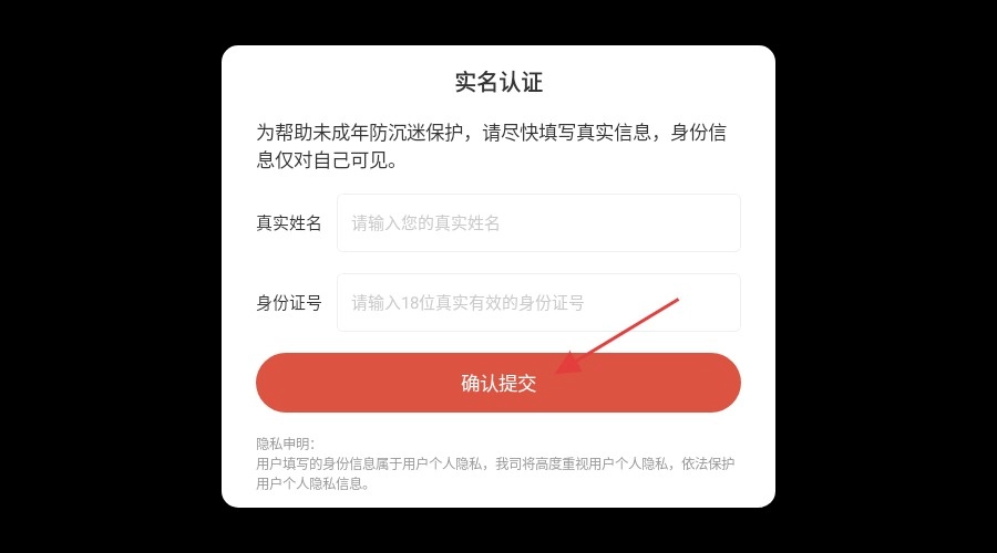 3、接着在【身份证号】输入框中填写有效的18位身份证号码,确认无误后点击【确认提交】按钮,即可完成认证流程。