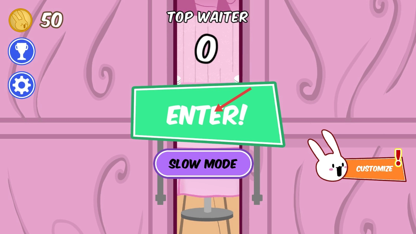 1、看到绿色的【ENTER!】按钮,点击它进入游戏,开启服务类的游戏挑战。