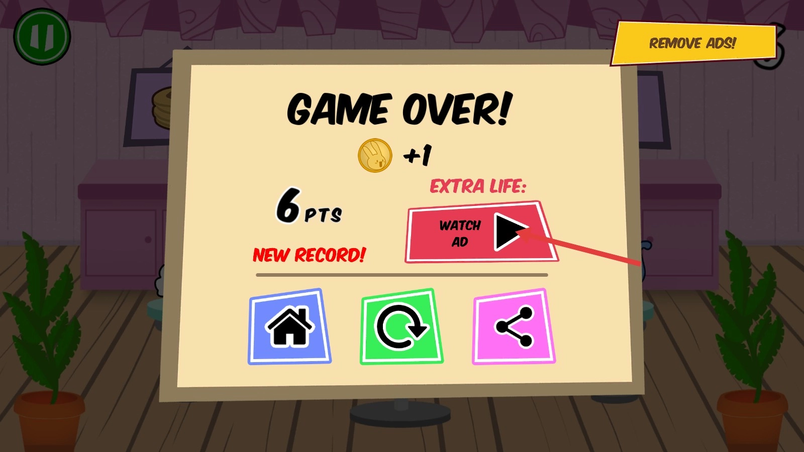 4、游戏结束后,界面显示【GAMEOVER!】,可点击【WATCH-AD】获取额外生命,也能选择其他按钮,同时还能获得金币奖励。