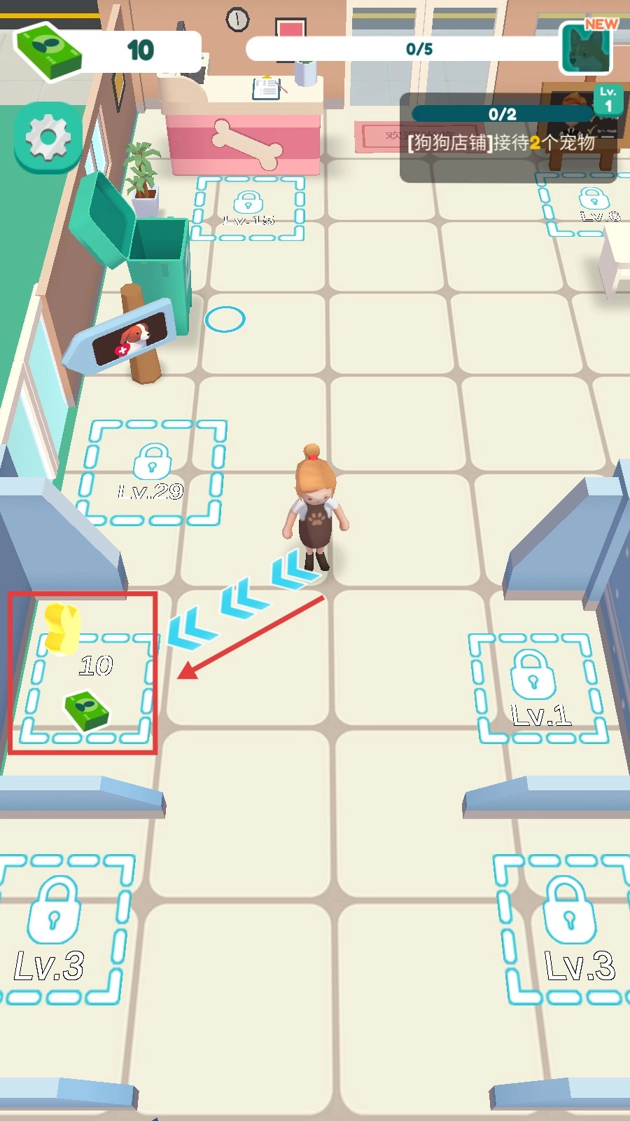 1、进入迷你宠物店,跟着箭头指引,走到有钞票标识的区域,解锁照顾区,为经营店铺做准备呢。