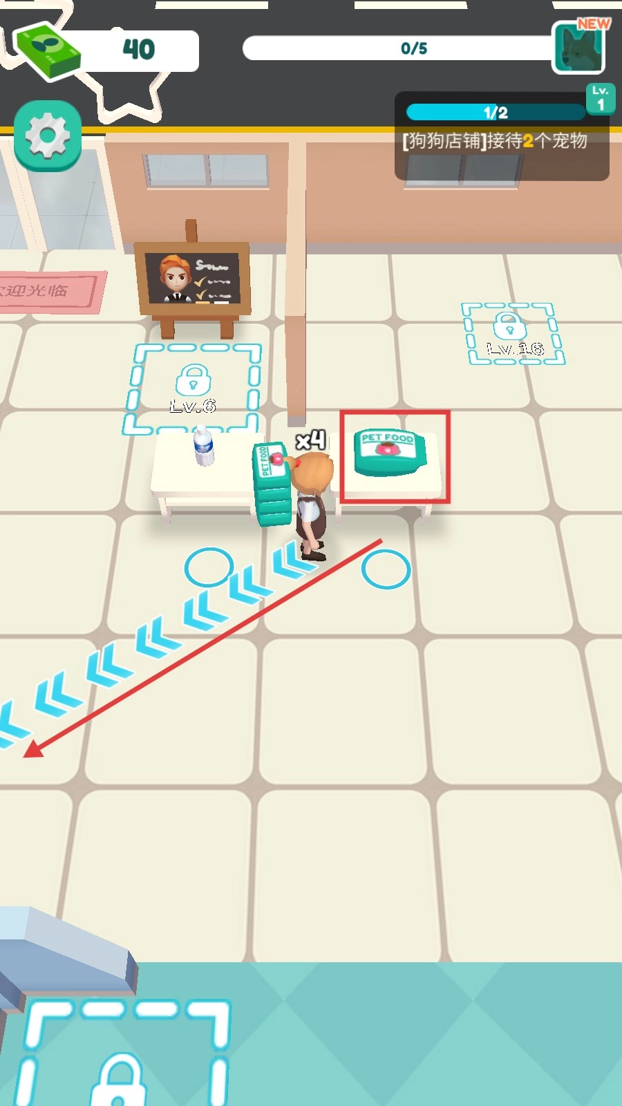 4、看到宠物食品,按照箭头方向,把食物搬运到对应区域,给宠物喂食,助力店铺经营升级。