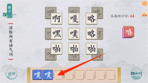 在五种特色模式里挑选“消除语气词”的玩法,系统就会自动生成含有各类感叹词的文字矩阵。