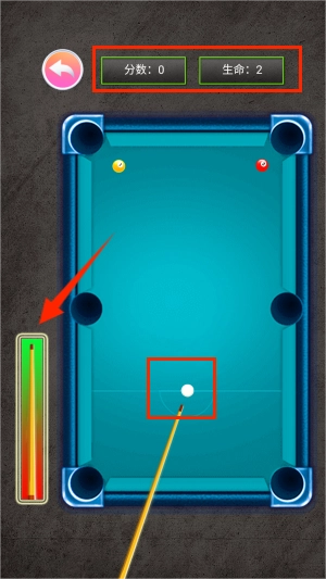 最上面显示的是分数和你的生命值。你得先瞄准,然后击打白球,把桌面上的其他球都打进洞里。