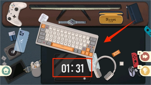 瞧瞧这桌面,东西堆得也太杂乱了吧!你得在倒计时结束前,把桌面上的物品都收拾干净、摆放整齐才行哦。