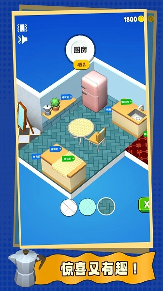 盲盒英雄是一款玩法有趣、画面简约的休闲闯关。这款游戏采用了精美的3D建模和明快的色彩搭配,为玩家打造出轻松惬意的游戏氛围,玩家可以在游戏中充分体验开盲盒的乐趣,将自己开出的家具和装饰品自由放置在房屋布局中,盲盒抽奖玩法不仅为玩家带来超多惊喜,而且还为玩家提供了超高的放置自由度,让玩家可以发挥想象力,将房屋变得更温馨。