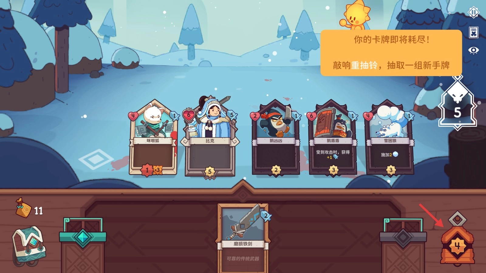 4、当手牌将耗尽时,敲响右侧【重抽铃】,抽取新的手牌,延续战斗策略哦。