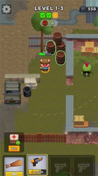 1、化身一只勇敢的小猪,通过射击敌人、躲避障碍、收集道具等方式,持续冒险闯关。