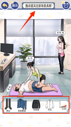 进入关卡后,下方摆放着不少道具,像衣服、鞋子、丝袜、合同之类的都有。