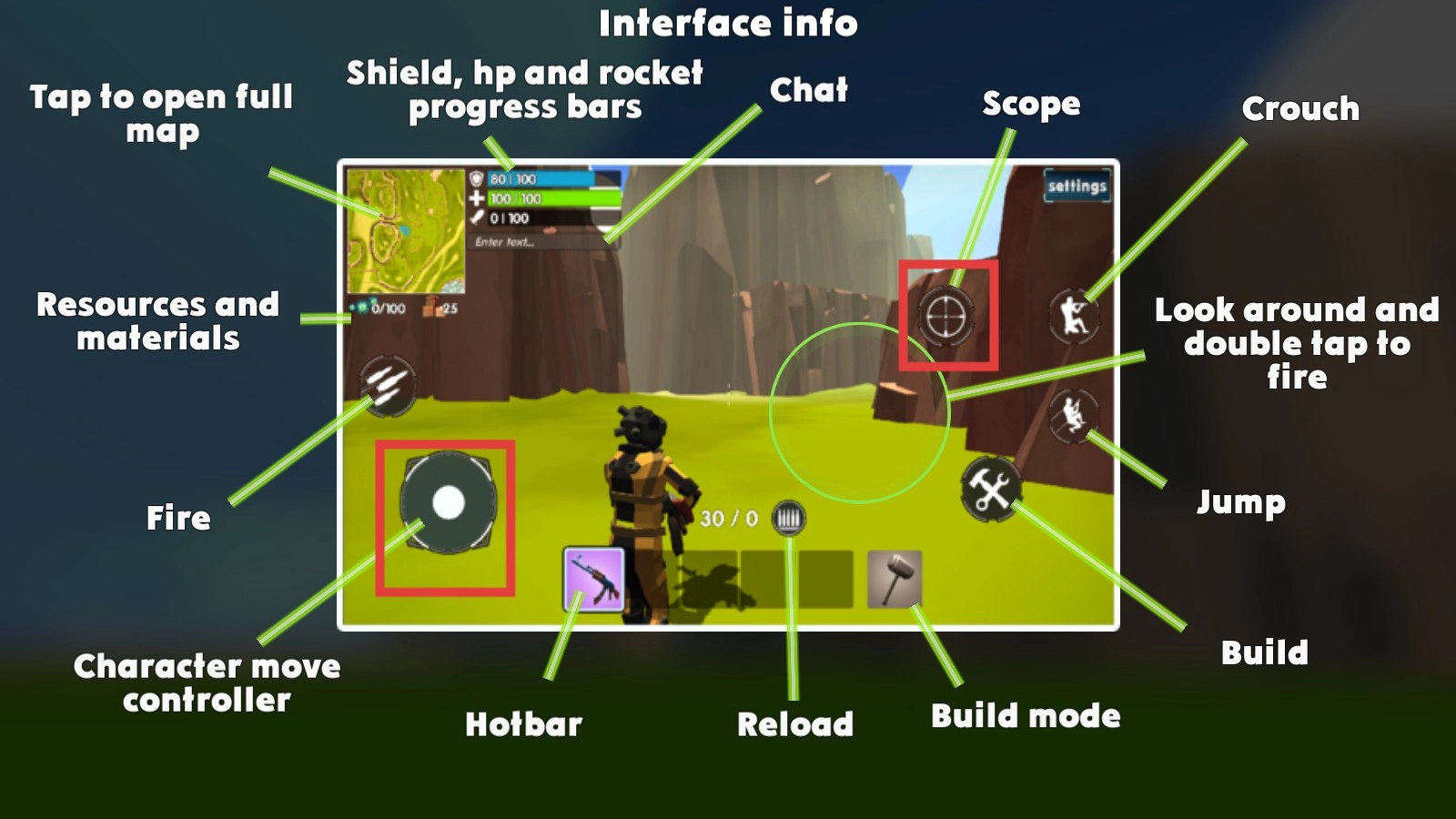 2、通过左摇杆控移动,右区【射击/瞄准/蹲伏/跳/建造】,紧盯上方【护盾/HP/火箭】条,活用小地图探资源。