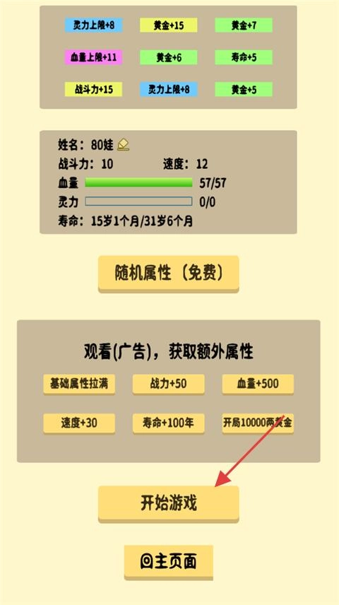 在角色属性设置页面,你可以根据自己的需求点击【随机属性(免费)】选项,也能通过观看广告来获得额外的属性点数。等调整好角色的各项属性后,再点击【开始游戏】按钮就可以了。