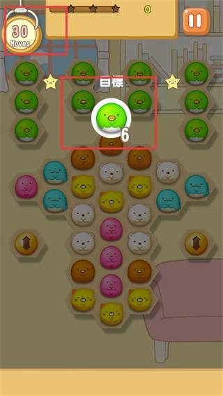 关卡目标是消除6个绿色形象方块,初始步数为30步,建议优先从锁定绿色形象方块开始进行消除操作。