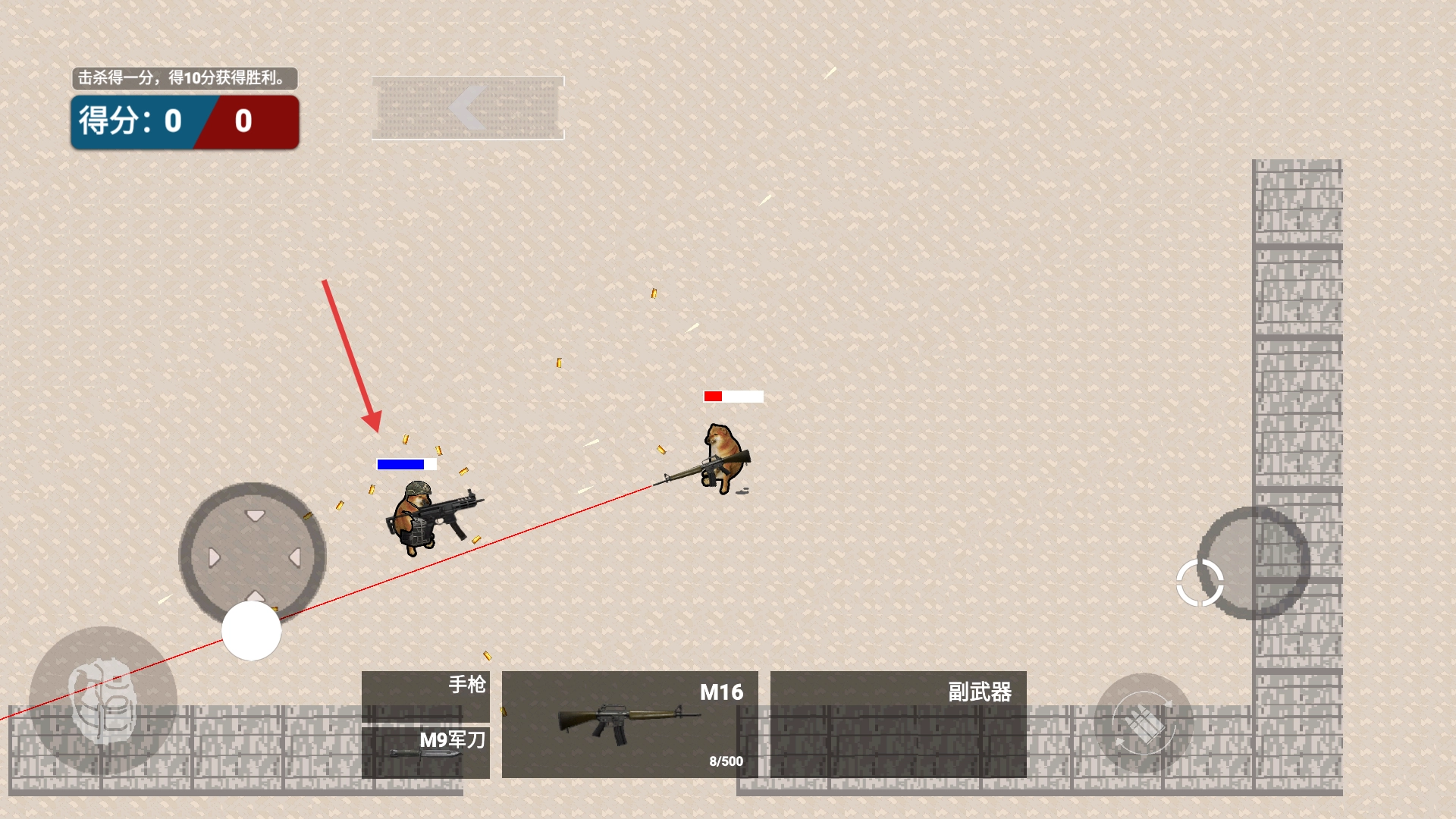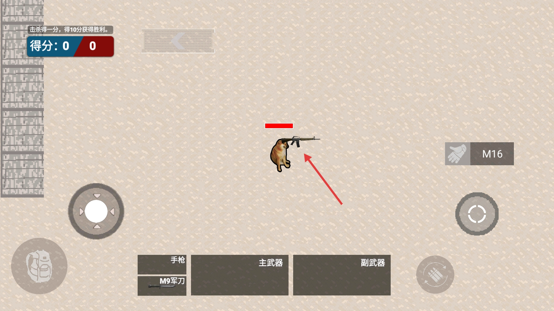 在战斗过程中拾取【M16】武器,校准枪口准星对准敌人,每次成功击杀都能获得积分,当积分累积到10分时就能赢得这场战斗的胜利。