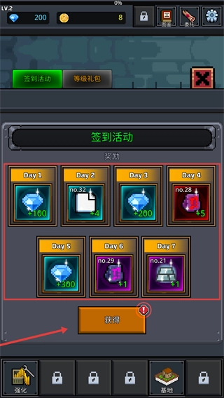 请及时领取【感谢您的安装】和【从PixelStar获取新闻】这两项奖励,这样就能快速积累【钻石】,为之后强化角色提前做好准备。
