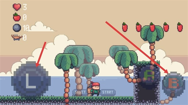 3.游戏操作非常简单。按【START】键调整按钮位置,再按SELECT键在摇杆和十字键之间切换。其中,L键用于控制角色的移动方向,A键可以向上或向下滑动,实现向上或取消投掷炸弹的操作,B键为跳跃键。