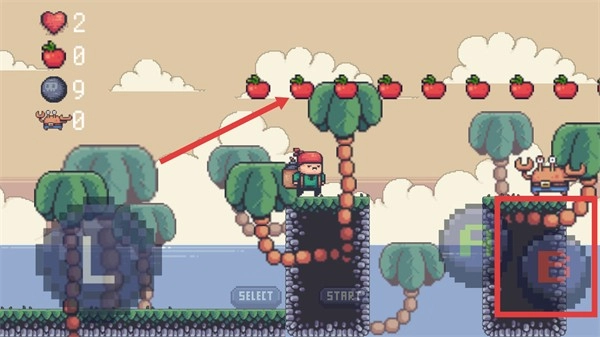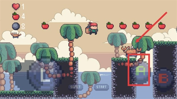 4.在第一关中,要注意棕榈树会随机掉落水果炸弹。同时,控制好角色的跳跃高度。长按跳跃键可以让角色跳得更高。