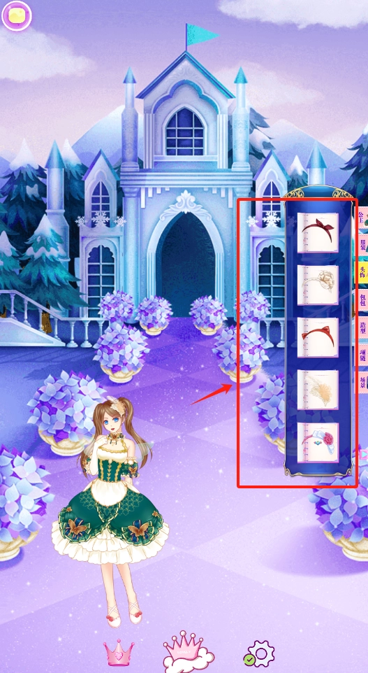 看看右边红框标注的饰品栏,点击箭头挑选你喜欢的饰品,为公主佩戴上吧。