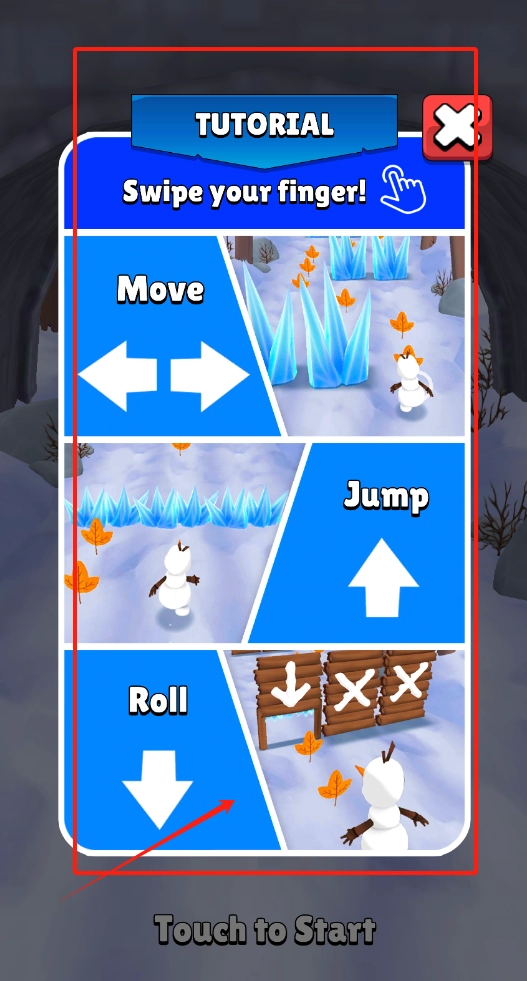 用手指在屏幕上上下左右滑动,以此操控雪人进行移动、跳跃和翻滚的动作;教程播放完毕后,点击叉号将其关闭。