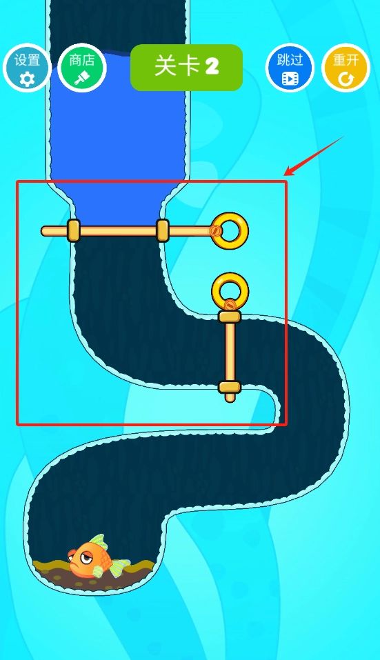当你看到弯曲水道里的金鱼时,拖动红框内的杆子来改变水流方向,帮助金鱼成功脱困即可过关。