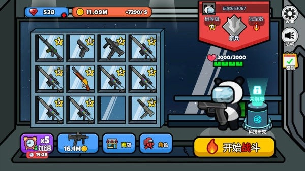 游戏主界面底部排列着各式各样的武器装备,花费积攒的金币就能购买初始枪械。