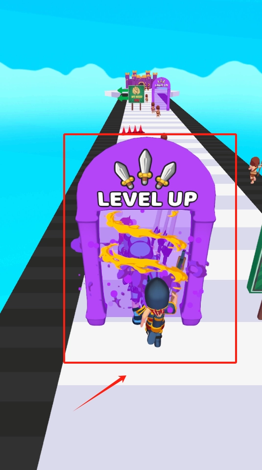 当你看到那个紫色的LEVEL UP拱门时,操控角色跑向它就能完成升级,然后进入下一关啦。