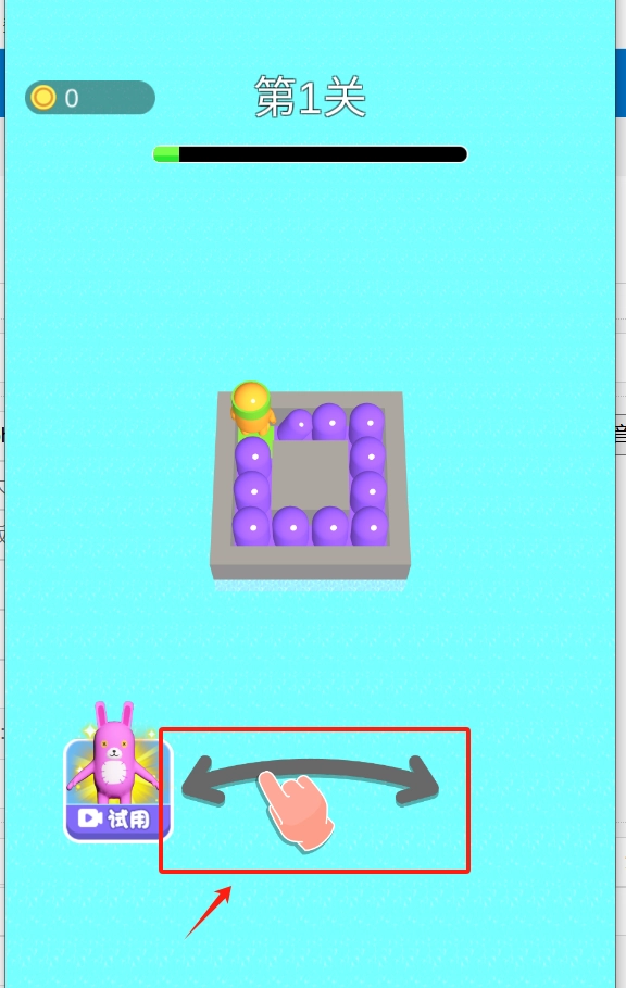 点击中间红框里的“开始游戏”按钮,进入第一关后,先用兔子角色尝试一下玩法。