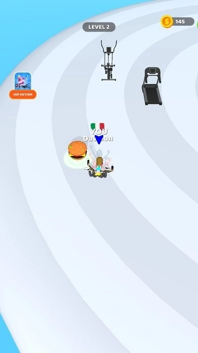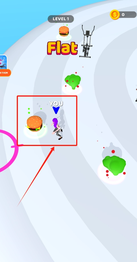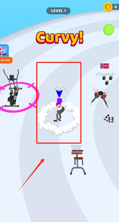 紫色小人头顶标着“YOU”,它会沿着白色烟雾指引的方向前进,同时要避开被粉色圈标记的健身器材。