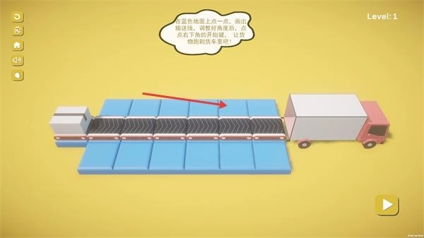2、按提示在地面点击,画出传送带路径,连接左侧箱子与右侧货车的位置。