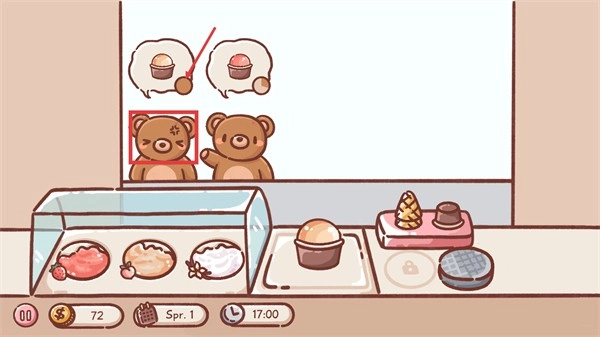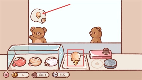 2、将制作好的对应冰激凌放置到柜台,完成顾客订单,获取金币奖励,同时推进时间进度。