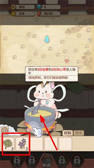 你可以按住材料栏里的药材,然后把它拖到药锅中,这样就能完成制药的材料准备工作了。